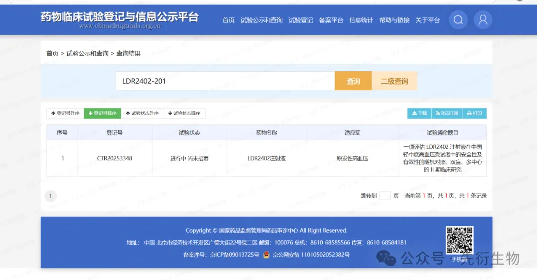 近日,小核酸技术创新与新药研发企业先衍生物自主研发的1类新药LDR2402注射液的2期临床试验申请在国家药品监督管理局药品审评中心(CDE)官网公示。