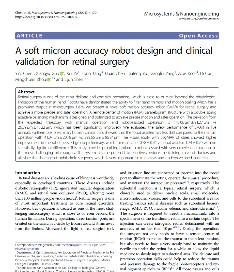 近日,由浙江省人民医院、浙江大学、慕尼黑工业大学及「迪视医疗」(全称“杭州迪视医疗生物科技有限公司”)联合发表了一篇名为“A soft micron accuracy robot design and clinical validation for retinal surgery”(点击阅读原文)(《一种柔性微米级精度的视网膜手术机器人研发及临床验证》)的文章,该成果收录于Nature旗下期刊1区TOP杂志Microsystems & Nanoengineering (IF=9.9)