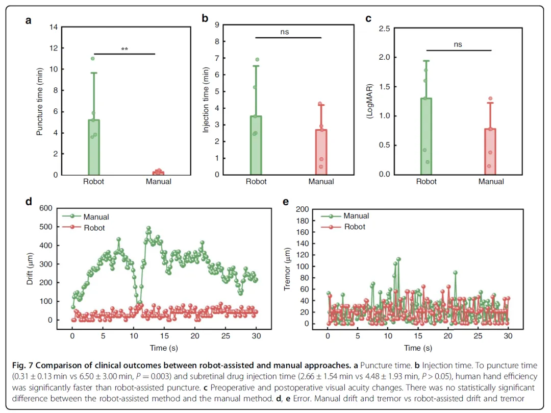 在动物实验中,SMAR展现了卓越的安全性和有效性。10只猪的实验结果显示,机器人辅助组的注射成功率高达100%,而手动组仅为80%。此外,机器人辅助组的操作时间虽略长于手动组,但随着操作次数的增加,时间差距逐渐缩小,表明机器人系统的学习曲线较短,易于上手。在人体科研临床试验中,10名视网膜下出血患者参与了试验,其中5例采用机器人辅助手术,5例采用传统手动手术。结果显示,机器人辅助组的漂移量仅为41.07微米,远低于手动组的299.66微米。由于使用机器人稳定性大幅度提高从而减少了对视网膜视觉神经细胞的损伤,从而机器人辅助组的视力改善趋势更为显著(Mean LogMAR 1.24 VS 0.7 有1.77倍提升),且手术过程中未出现任何注射相关并发症。