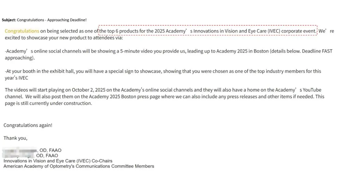 国庆前夕,3N Eyecare 被 AAOpt 邮件告知(见下图)获得了 2025 年 AAOpt “视觉与眼健康创新奖(IVEC)Top ”殊荣。