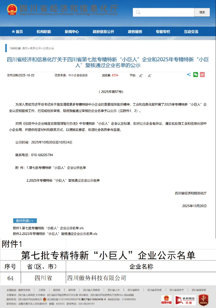 近日,「傲势科技」(AOSSCI)凭借在工业级无人机领域的深厚积累与卓越创新,成功入选国家工业和信息化部第七批国家级专精特新“小巨人”企业名单