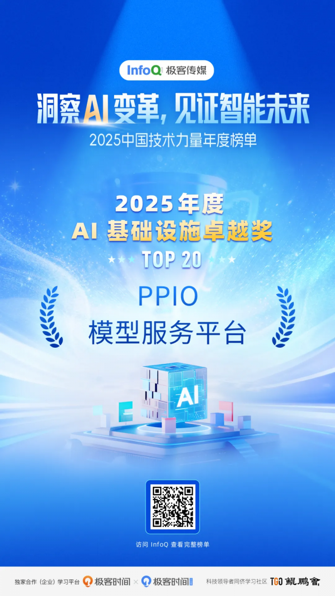 近日,InfoQ「2025 中国技术力量年度榜单」正式发布,「PPIO」模型服务平台凭借在分布式算力调度与模型推理加速领域的深厚技术积淀,与阿里云、腾讯云等行业巨头一并荣获「InfoQ 2025 年度 AI 基础设施卓越奖」
