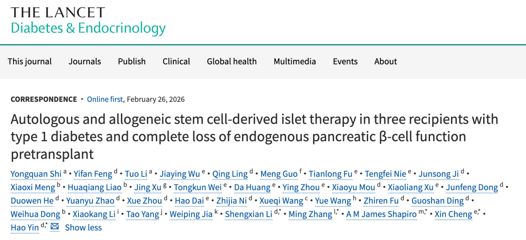 2026年2月27日,海军军医大学上海长征医院殷浩团队联合中国科学院分子细胞科学卓越创新中心(生物化学与细胞生物学研究所)程新研究组在国际顶级期刊Lancet Diabetes & Endocrinology(在191种内分泌与代谢学期刊中排名第一)发表了最新研究成果:“Autologous and allogeneic stem cell-derived islet therapy in three recipients with type 1 diabetes and complete loss of endogenous pancreatic β-cell function pretransplant”。