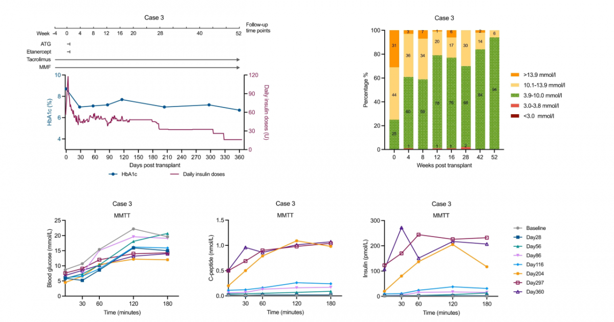 此次研究有三例严重1型糖尿病患者案例,他们分别采用自体或异体内胚层干细胞来源的再生胰岛(E-islet),并在不同免疫抑制策略下评估疗效与安全性,取得了鼓舞人心的临床结果。